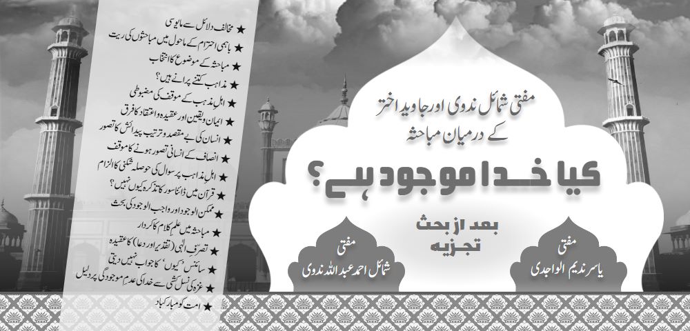 ممتاز عالمِ دین مفتی شمائل احمد عبد اللہ ندوی اور نامور نغمہ نگار جاوید اختر کے درمیان کانسٹیٹیوشن کلب، دہلی، بھارت میں ۲۰ دسمبر ۲۰۲۵ء کو ’’کیا خدا موجود ہے؟‘‘ کے موضوع پر دو گھنٹے دورانیہ کا ایک مباحثہ منعقد ہوا جس کی نظامت معروف صحافی ابھیسار شرما نے کی۔ مباحثہ کا ضابطہ کچھ اس طرح تھا کہ فریقین کی جانب سے گفتگو کے متعدد ادوار کے علاوہ سامعین کے سوالات و جوابات کا دور بھی ہوا: