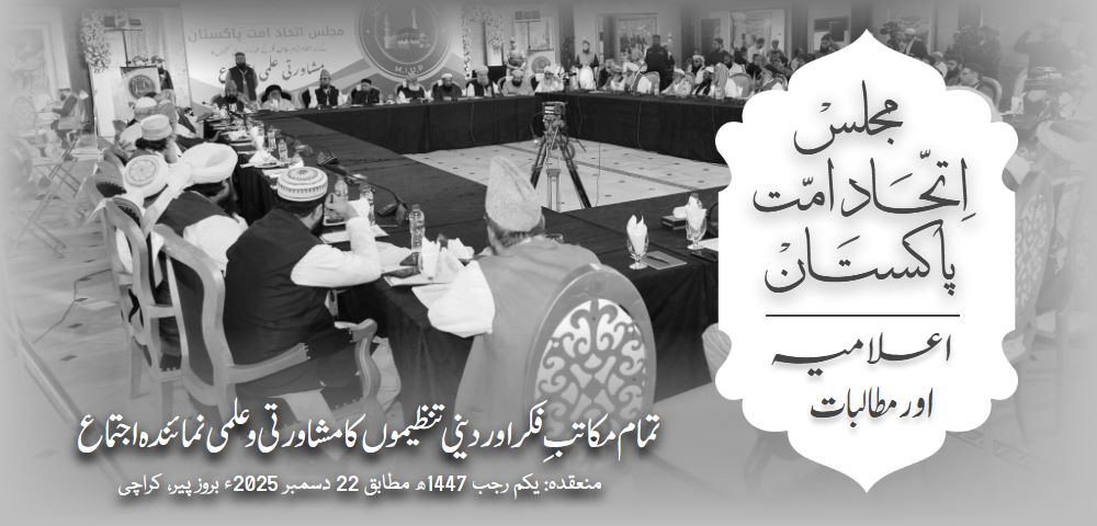 مجلس اتحادِ امت پاکستان کے زیرِ انتظام تمام مکاتبِ فکر اور دینی تنظیموں کا مشاورتی و علمی نمائندہ اجتماع منعقدہ یکم رجب 1447ھ مطابق 22 دسمبر 2025ء بروز پیر، کراچی کا اعلامیہ اور مطالبات ’’الخیر میڈیا سیل‘‘ اور ’’مدارس نیوز‘‘ کے شکریہ کے ساتھ یہاں پیش کیے جا رہے ہیں۔ (ادارہ الشریعہ)