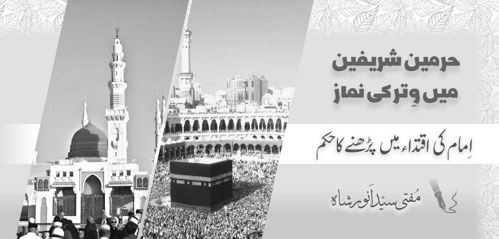 حرمین شریفین میں وتر کی نماز ائمہ حرمین کی اقتداء میں پڑھنے کا مسئلہ معرکۃ الآراء مسائل میں سے ہے، کیونکہ احناف کے یہاں تین وتر ایک سلام کے ساتھ ہے، جبکہ اِس وقت ائمہ حرمین شریفین حنبلی مذہب کے موافق دو سلاموں کے ساتھ تین وتر پڑھاتے ہیں۔ اصولی طور پر اس مسئلہ کا تعلق مخالف فی الفروع امام (یعنی شافعی، حنبلی اور مالکی) کی اقتداء میں وتر پڑھنے سے ہے۔