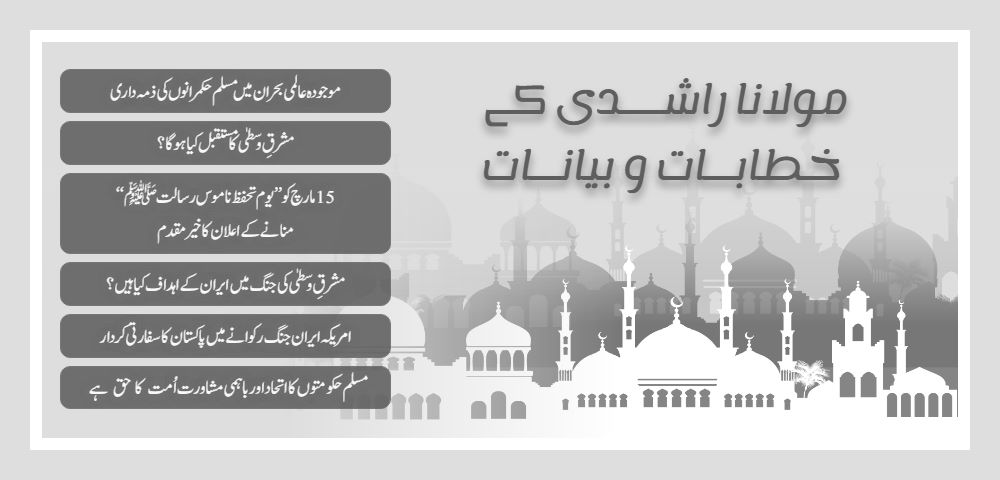 مولانا راشدی نے کہا کہ مسلم حکمرانوں کو صدر ڈونالڈ ٹرمپ کے جال سے باہر نکل کر امت مسلمہ کی بنیاد پر اپنے مسائل کا حل تلاش کرنا چاہیے اور عالمی استعمار کو اپنے اختلافات و تنازعات سے فائدہ اٹھانے کا موقع نہیں دینا چاہیے۔